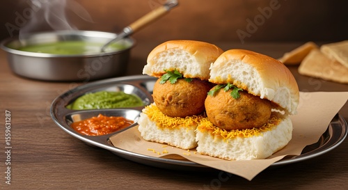 indian food, snack, fast food, authentic, traditional, bombay, bun, bread, chutney, spicey, savoury, delicious, hot, fresh, appetising, meal, serving, plate, metal plate, pot, pan, steam, food photography, photorealistic, closeup, depth of field, wooden table, rustic, culinary, vegetarian, comfort food, vibrant