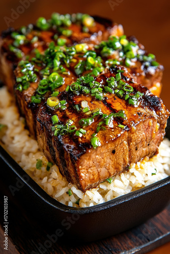 Delicious Japanese-style steak with soy glaze served with rice, perfect for culinary enthusiasts and food lovers.