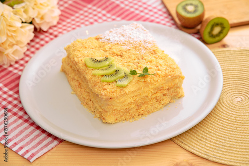 kiwi, cake, plate, chequered, napkin, flower, dessert, sweet, slice, icing, cream, crumb, white, green, fresh, wooden, table, kitchen, decor, homemade, pastry, delicious, tasty, garnish, powder, sugar, yellow, fruit, floral, elegant, culinary, treat, receipe, eatery, epicure, bakery, artistic, food, dining, invitation, festive, celebration, display, decorative, confectionery, tempting, appetising