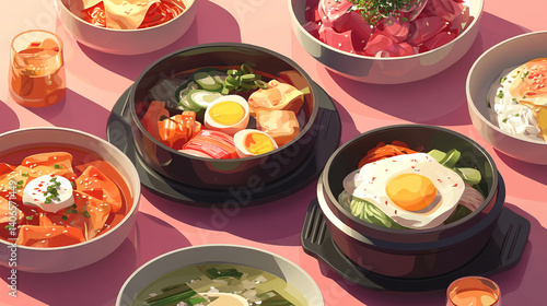 korean, food, bowl, kimchi, soup, culinary, feast, sense, asian, cookery, dish, meal, lunch, dinner, traditional, culture, egg, vegetable, rice, meat, spicey, delicious, healthy, fresh, ingredient, presentation, eatery, table, pink, bowl, glasses, epicure, style, art, illustration, drawing, graphic, design, colourful, vibrant