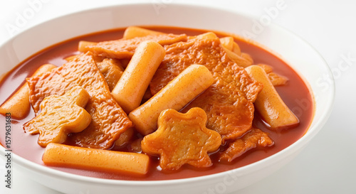 Delicious Korean Tteokbokki Spicy Rice Cakes and Fish Cakes Served in a White Bowl