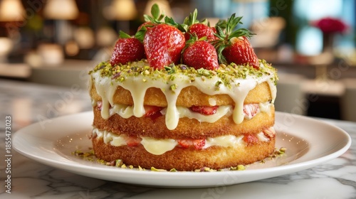 Delicious layered cake with strawberries and cream topping, decorated with pistachios, served on a marble table