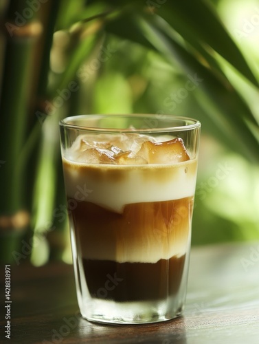 Delicious Layered Iced Coffee Drink with Milk and Ice Cubes Against Green Foliage Background