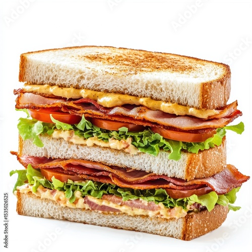Delicious layered sandwich with crispy bacon fresh vegetables and creamy spread between toasted bread slices healthy snack