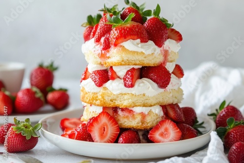 Delicious layered strawberry shortcake served on a plate with fresh strawberries and whipped cream, Layered strawberry shortcake on plate, adorned with fresh strawberries