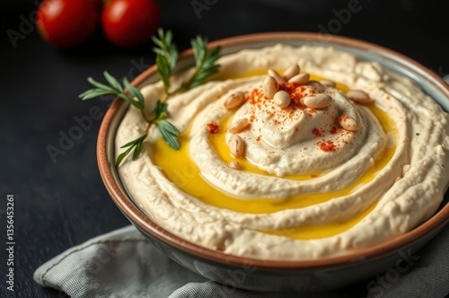 hummus, olive oil, pine nut, paprika, dark background, vegan, epicure, ethnic food, delicious, savoury, snack, food photography, mediterranean, spice, comfort food, homemade