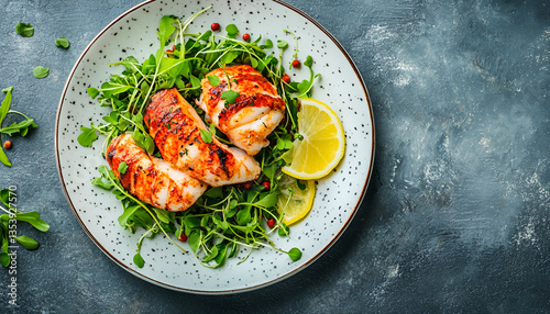 Delicious lobster tail with microgreens and lemon slices on grey textured table, closed