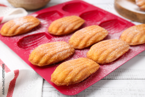 Delicious madeleine cookies in baking mold on white wooden table, closeup
