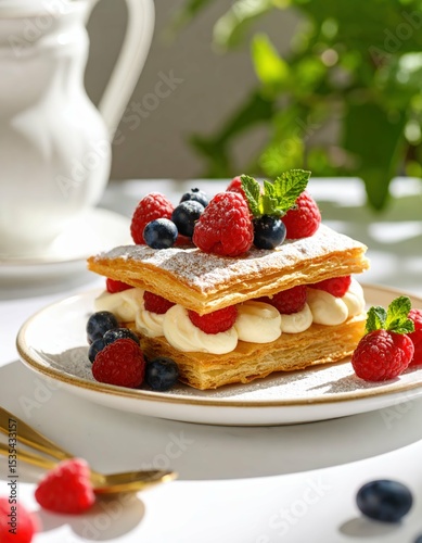 Delicious mille feuille pastry with raspberries blueberries and cream dessert