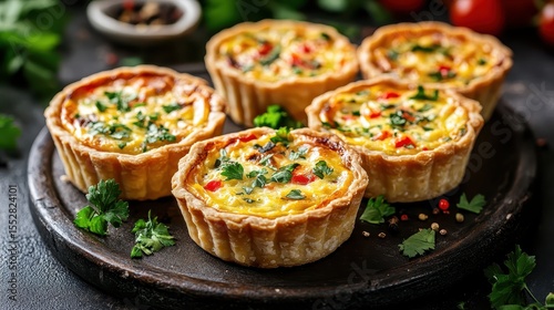 Delicious mini quiches with flaky crusts are on a dark wooden tray. Use this image for food blog, menu or recipe demonstration designs.