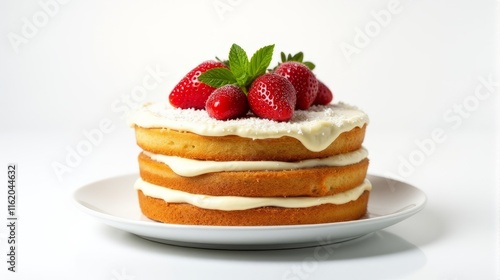 Delicious Multi Layered Cake Adorned With Fresh Strawberries And Mint Leaves on Top.