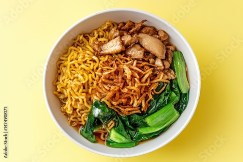 Delicious Noodles with Chicken, Crispy Onions, and Bok Choy in a Bowl