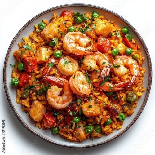 Delicious Paella with Shrimp on White Background Highlighting Colors and Textures in a Vibrant Dish Designed for Food Photography and Culinary Inspiration