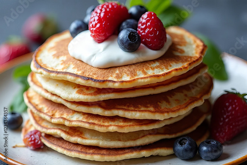 Delicious pancakes topped with fresh berries and cream, perfect for breakfast