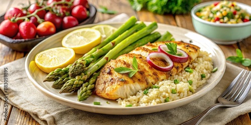 Delicious pan-seared fish fillet served with asparagus, lemon wedges, and creamy risotto on a rustic wooden table