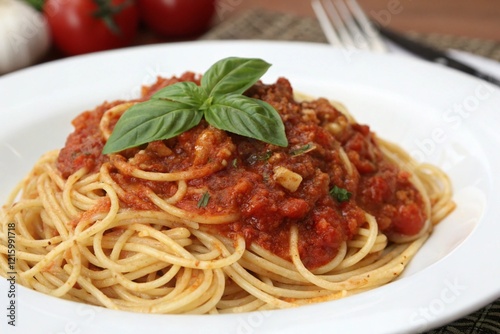 Delicious pasta spaghetti with tomato sauce garnished with a fresh basil leaf, cut out