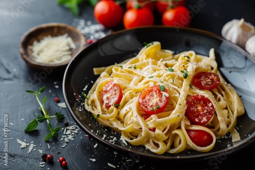 Delicious pasta with cherry tomatoes and parmesan on a dark plate