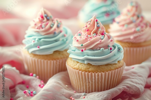 Delicious pastel-colored cupcakes with swirled frosting and sprinkles, perfect for celebrations and sweets lovers. Decorated with light pink and blue icing.