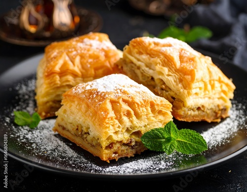 pastry, powdered, sugar, flaky, gold, dessert, sweet, nut, plate, dark, background, mint, food, delicious, arabic, baklava, layer, texture, closeup, sweetness, deliciously, tasty, treat, delightful, baked