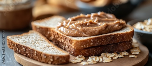 Delicious Peanut Butter Spread on Whole Grain Bread with Oats on Rustic Wooden Board in Cozy Kitchen Setting