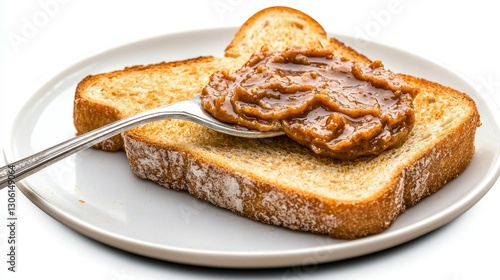 Delicious Peanut Butter Toast A Nutritious Breakfast or Snack, Capturing Golden-Brown Toast Slices Spread Generously with Creamy Peanut Butter, Served on a Classic White Plate, Perfect for Food