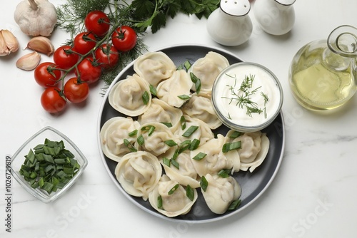 Delicious pelmeni with green onion served on white marble table, flat lay