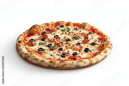 Delicious pepperoni pizza topped with olives, cheese, and fresh herbs on a golden crust, ideal for food photography.