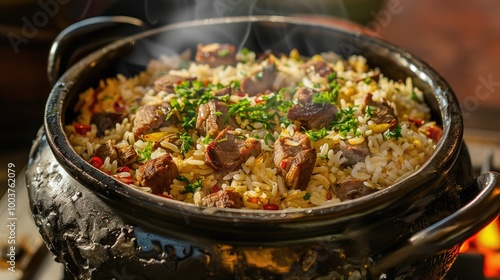 pilaf, rice, meat, cooked, cauldron, stove, gas, delicious, dish, meal, food, cookery, black, hot, steaming, fresh, dinner, lunch, epicure, tasty, savoury, homemade, hearty, traditional, culinary, aromatic, serving, flavorful, protein, grain, side, main, course, pot, utensil, kitchen, receipe, preparation, ingredient, dining, feast, eat, boil, simmer, stew, comfort, authentic, fries