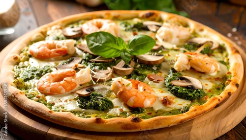 Delicious pizza with shrimp, mushrooms, and spinach