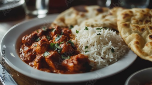 Delicious plate of curry with rice and naan served in a cozy restaurant setting during the evening dining hours