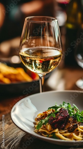 food, pasta, wine, meal, dining, eatery, epicure, plate, drink, sauce, side dish, arugula, dining table, wooden table, culinary, cookery, alcohol, beverage, dinner, lunch, ingredient, chef, home cooking, fine dining, table setting, savoury, delicious, snack, indulgent, elegant, glassware, relaxing, favor, aroma, catering, platter, eatery, hospitality, taste, freshness, celebration, enjoyment, upscale, serving