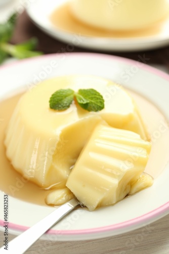 Delicious pudding with caramel sauce and mint served on white table, closeup
