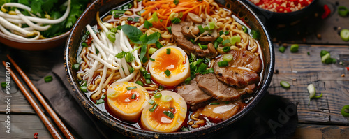 Delicious Ramen Noodle Soup with Pork, Eggs, and Vegetables - Food Photography