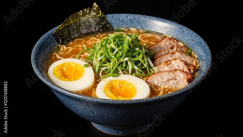 Delicious ramen with eggs pork and green onions in a blue bowl on a black background