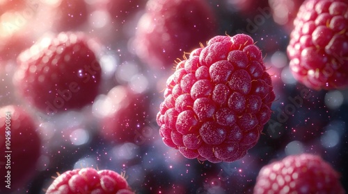 Delicious raspberries float in a dreamy cosmic setting, sparkling under soft light