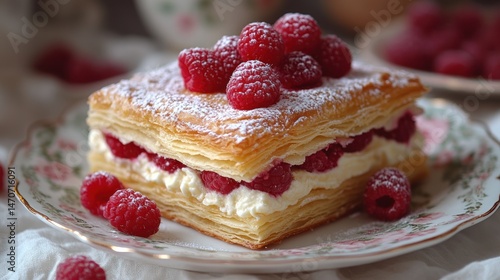 pastry, raspberry, dessert, food, sweet, delicious, creamy, cotton balls, mille-feuille, baking, culinary, confectionery, epicure, bakery, cake, sugar, flaky, layer, whipped, cream, fruit, red, plate, table, sweetness, tasty, treat, indulgent, receipe, cooking, photo, appetising, tempting, gastronomy