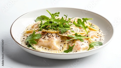 Delicious ravioli with cream sauce and fresh arugula garnish