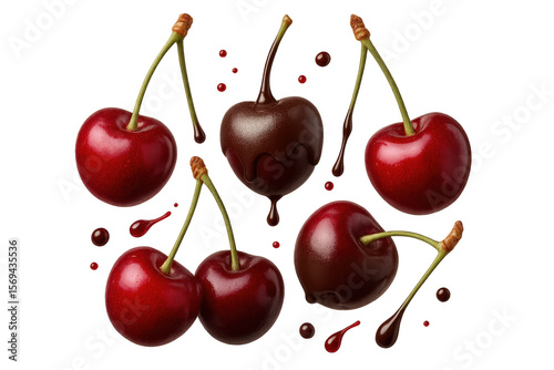 cherry, cherry, chocolate, drip, fruit, berry, sweet, dessert, treat, red, dark chocolate, isolated, cut-out, clipping path, studio shot, clean, delicious, fresh, ripe, juicy, vibrant, appetising, epicure, decadent, indulgence, rich, festive, elegant, attractive, deliciously, mouth-watering, tasty, summer, snack, food, high-quality, professional, closeup, group, arrangement, flying