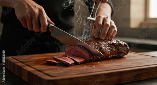 Delicious roasted beef slices being expertly carved on a wooden board red hot meat food cook chef