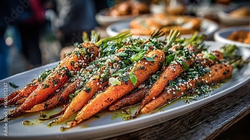 Delicious roasted carrots seasoned with fresh gremolata, sesame seeds, and a drizzle of olive oil, served on a white platter, offering a healthy and flavorful side dish