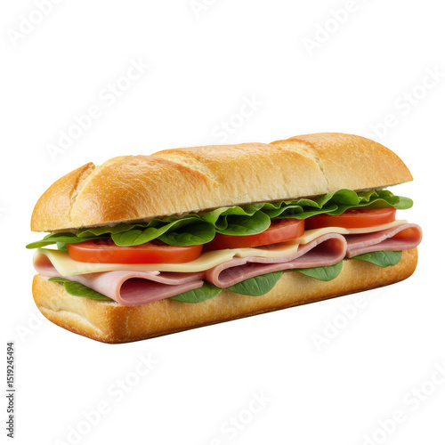 sandwich, baguette, food, lunch, delicious, ham, cheese, tomatoes, lettuce, fresh, meal, bread, cut, snack, white, tasty, meat, slice, salad, ingredient, cookery, nourishment, diet, eat, filling, produce, portion, closeup, transparent, background