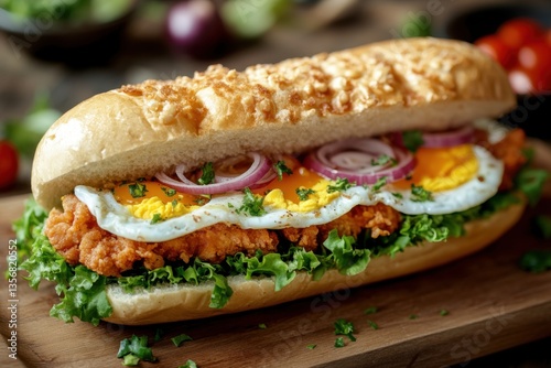 Delicious sandwich with fried chicken egg red onion and fresh lettuce on wooden board close up food photography