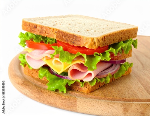 Delicious Sandwich with Ham Cheese and Vegetables on Wooden Board and White Background