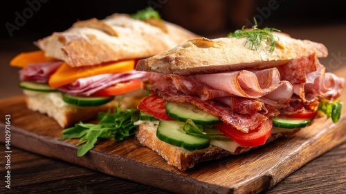 Delicious Sandwiches with Ham Salami Cheese and Vegetables on Wooden Board