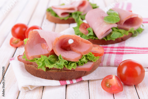 lettuce, ham, table, background, baguette, bread, breakfast, calorie, cereal, closeup, crust, delicious, diet, dinner, eating, fast, fast food, food, fresh, green, health, healthy, ravenous, lunch, meal, meat, napkin, natural, nobody, nourishment, open, salad, sandwich, single, slice, sliced, smoked, snack, starter, tasty, tomatoes, vegetable, white, wood, wooden