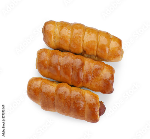 Delicious sausage rolls isolated on white, top view