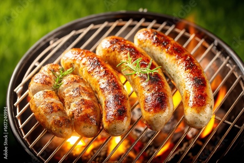 Delicious sausages grilling on a barbecue with flames and rosemary in a sunny day, perfect for summer meals