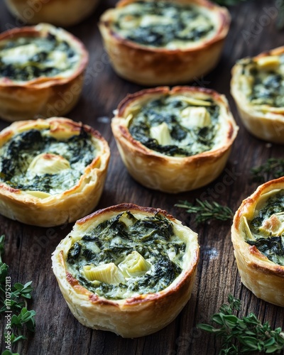 Delicious savory spinach and artichoke tarts on a rustic wooden surface.
