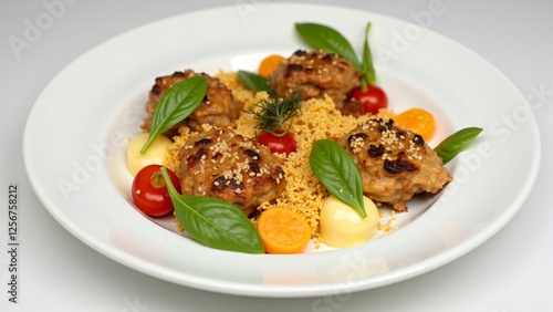 meatball, couscous, sesame, vegetable, cherry tomato, carrot, basil, dill, herb, health food, gourmet food, dinner, lunch, meal, food photography, delicious, tasty, appetising, fresh, vibrant, colourful, white plate, elegant, fine dining, cookery, receipe, cooking, eatery, menu, dinner, home cooking