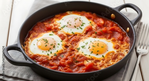 Delicious Shakshuka - Eggs Poached in Spicy Tomato Sauce.